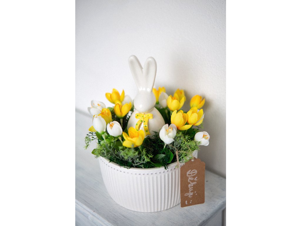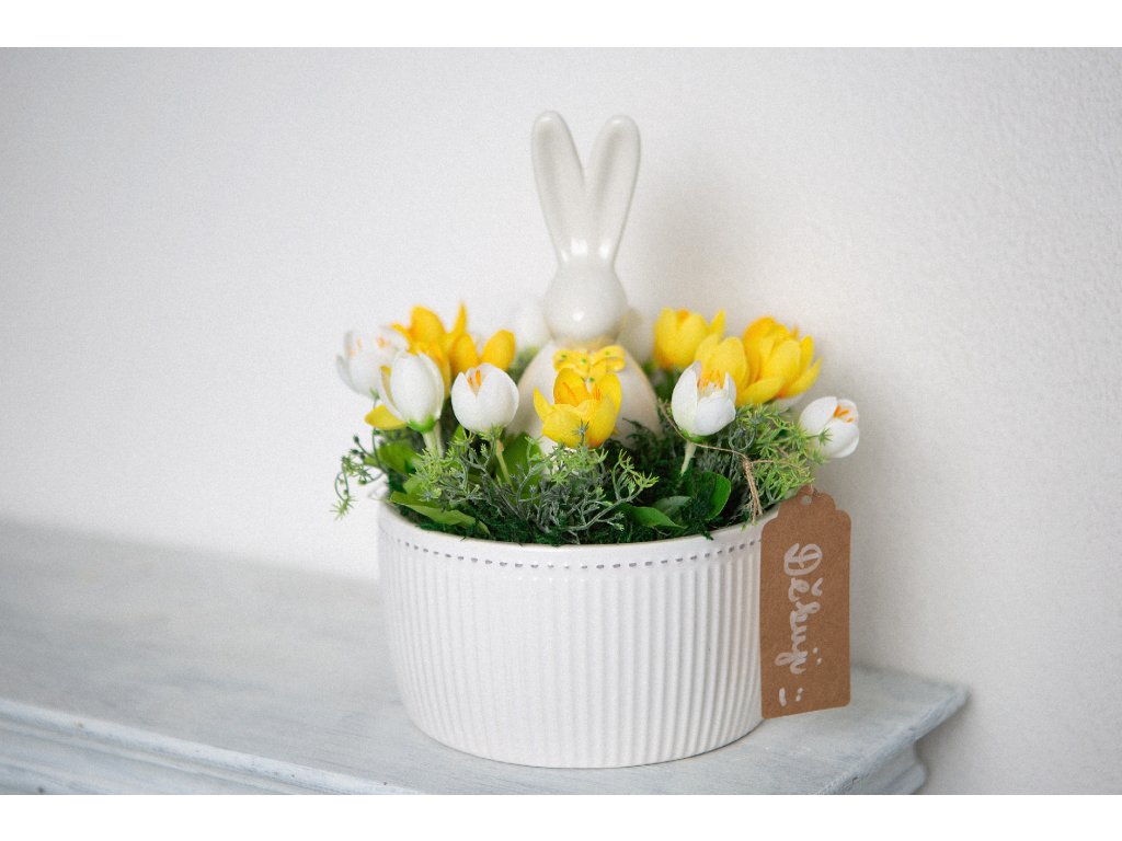 Dekorace v keramickém květináči se zajíčkem.