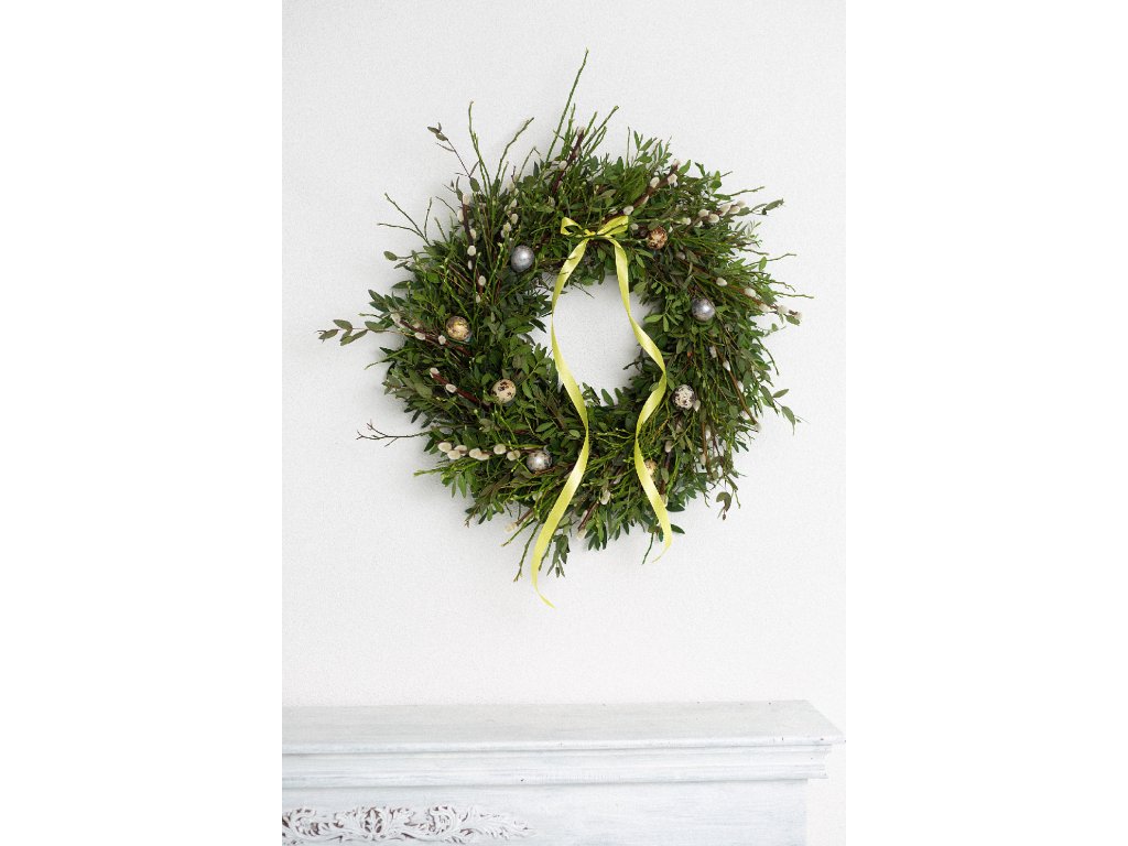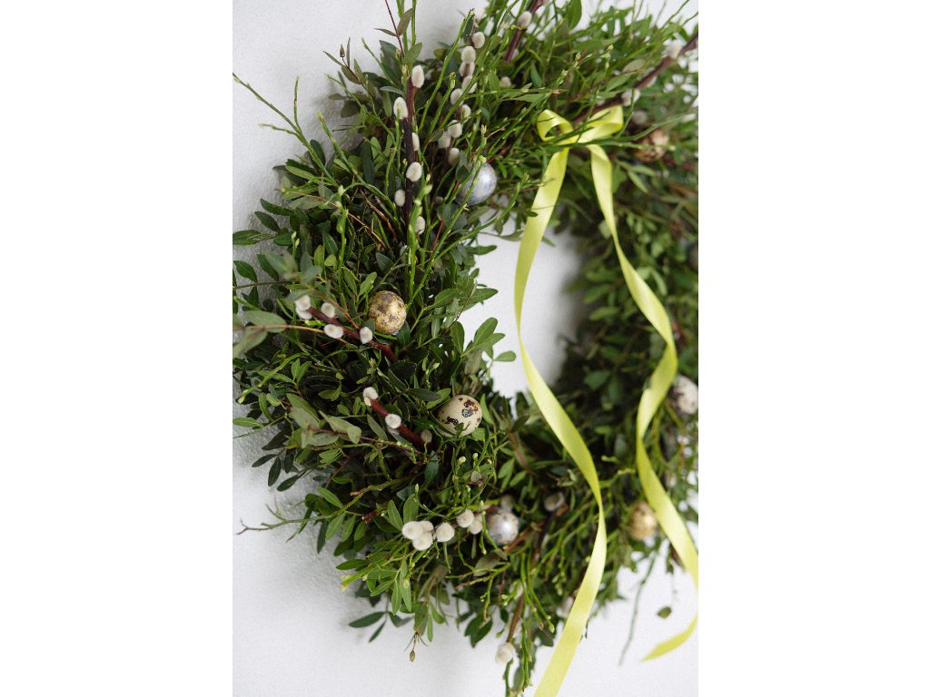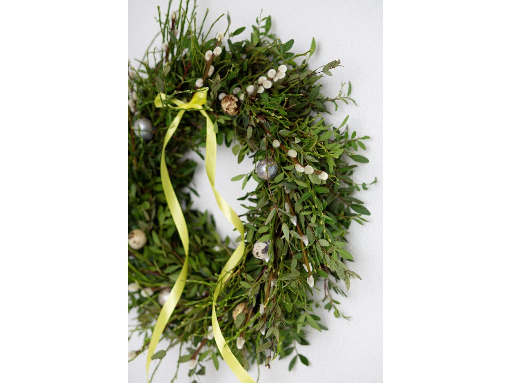 - uvázaný z pistácie, borůvčí, eukalyptu, kočiček, doplněný vajíčky a mašlí, kterou si můžete sundat