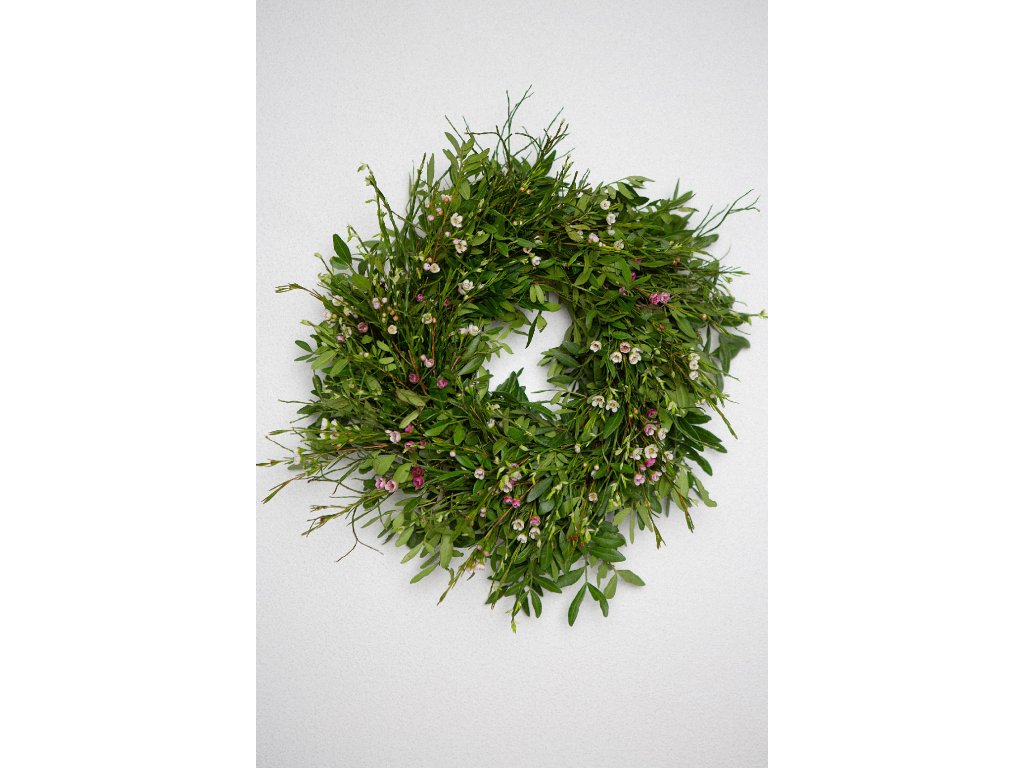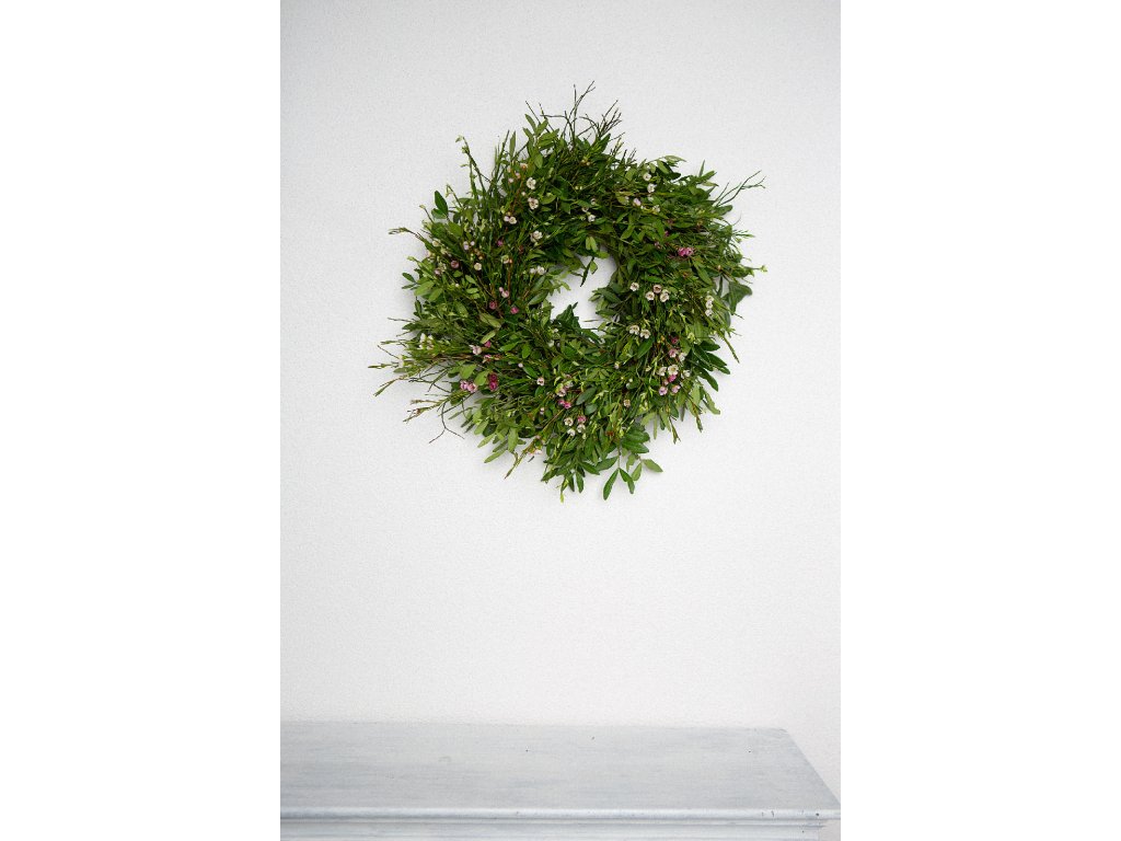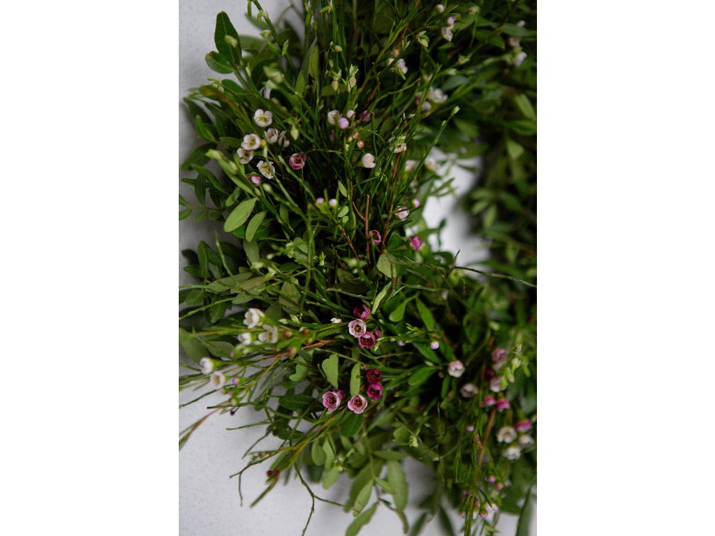 Jarní věneček z pistácie, borůvčí, doplněný kytičkami opuče.