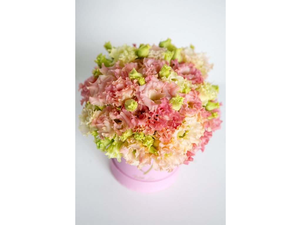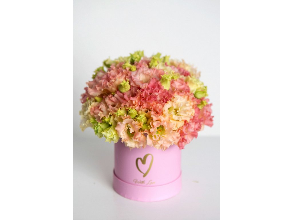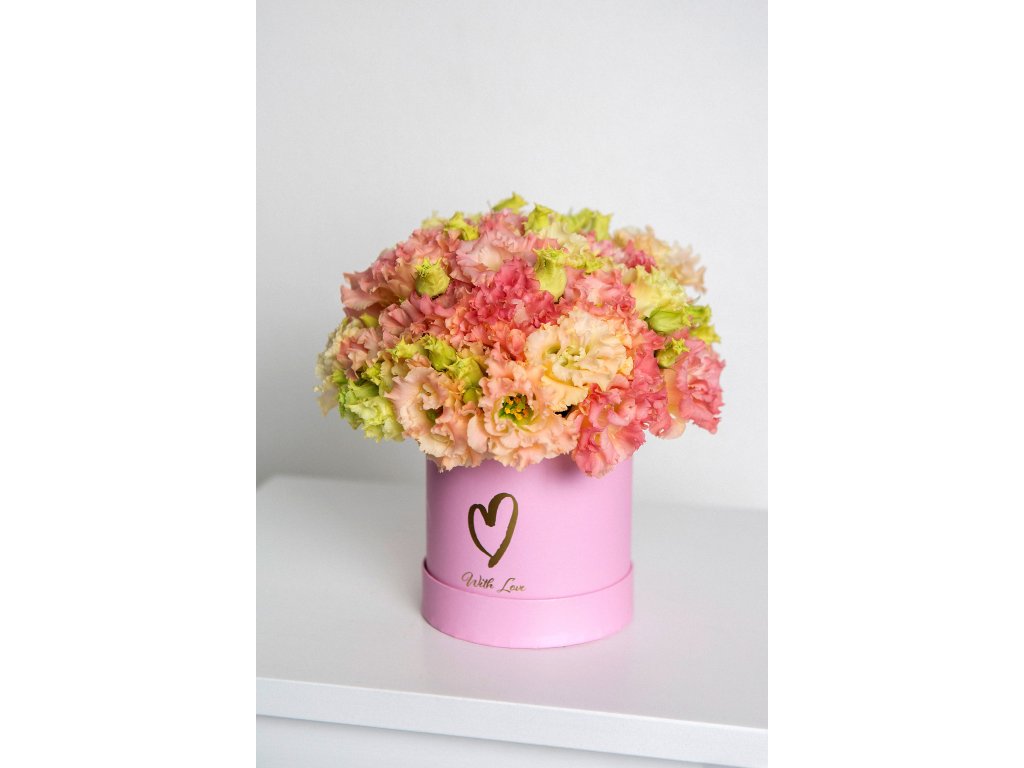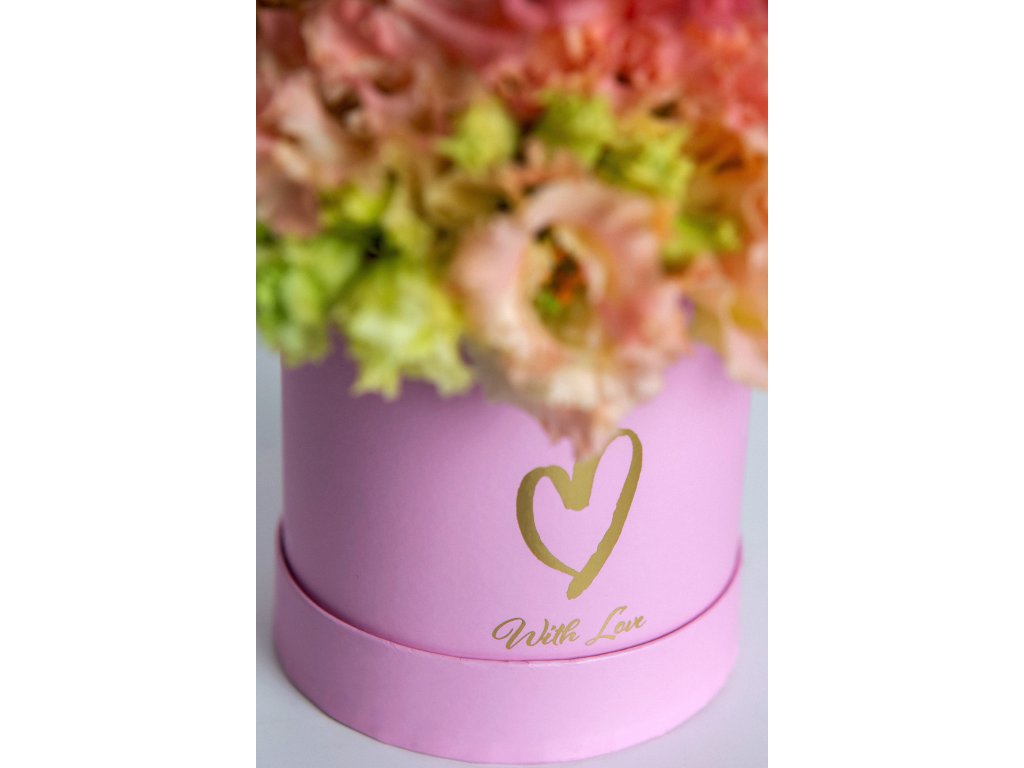 Flower box s květinami Eustoma, růžový s nápisem With love, rozměr boxu 11x11 cm + aranžované květiny.