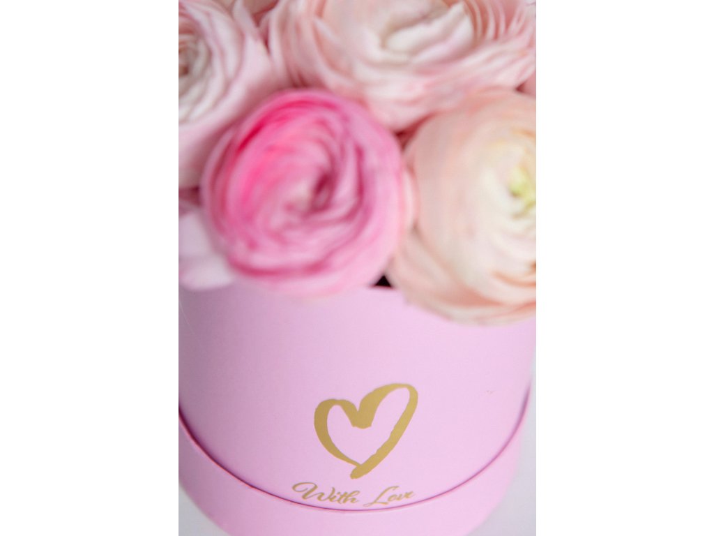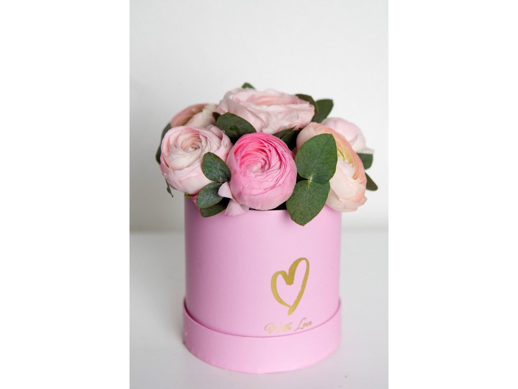 Flower box s květinami Ranunculus (pryskyřník) a eukalyptem, růžový s nápisem With love, rozměr boxu 11x11 cm + aranžované květiny.