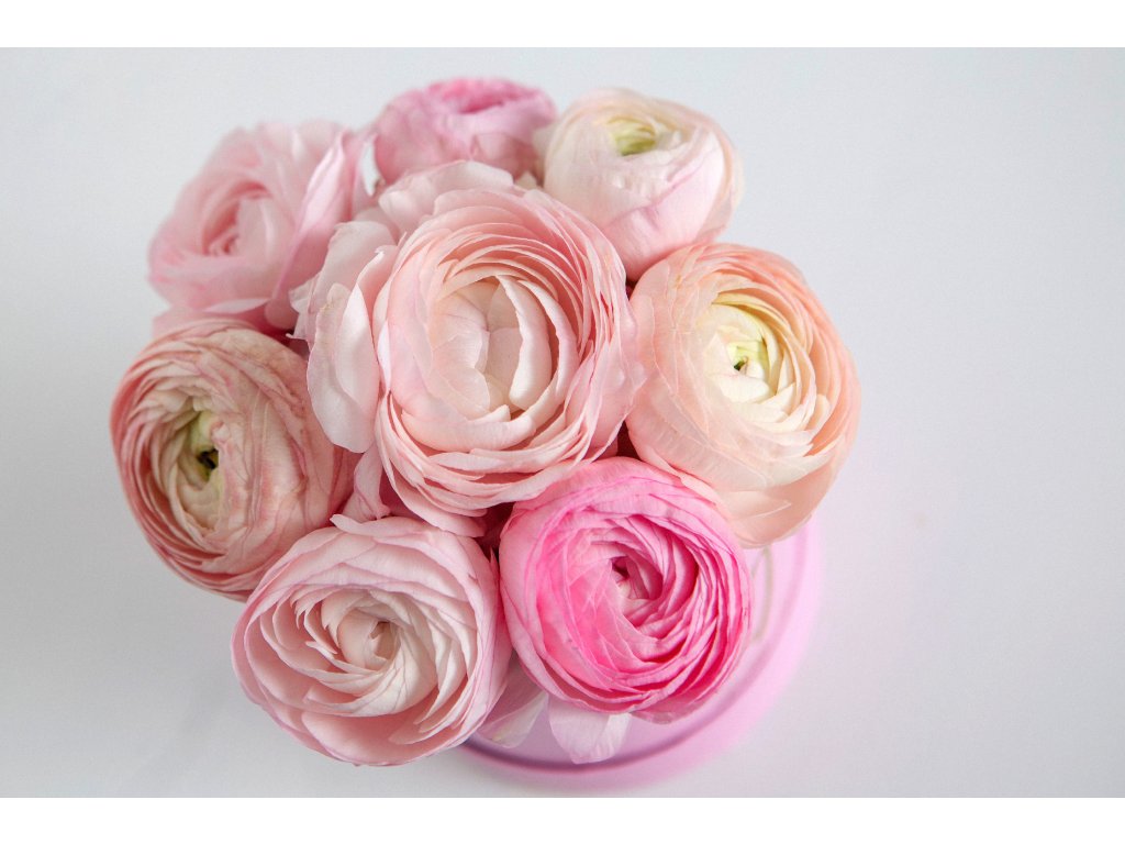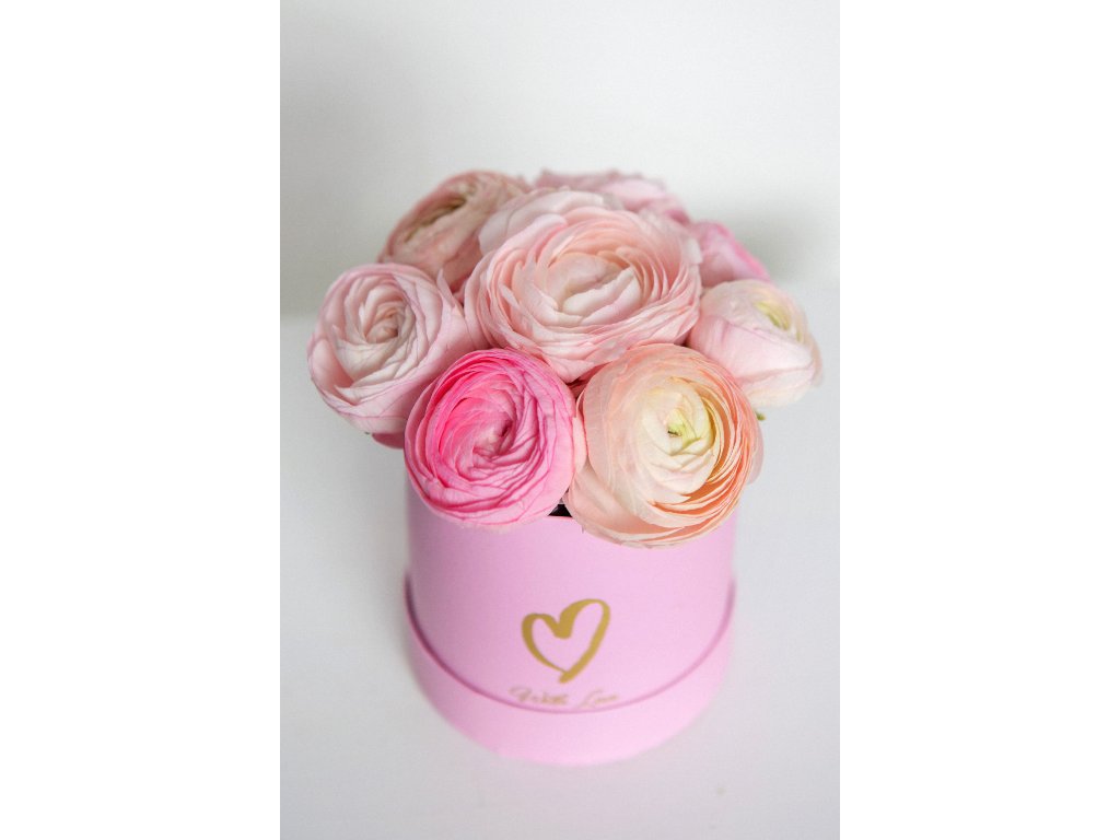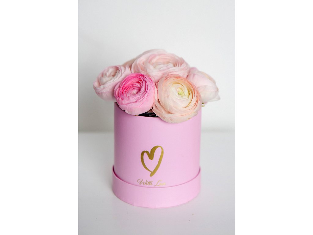 Flower box s květinami Ranunculus (pryskyřník), růžový s nápisem With love, rozměr boxu 11x11 cm + aranžované květiny.