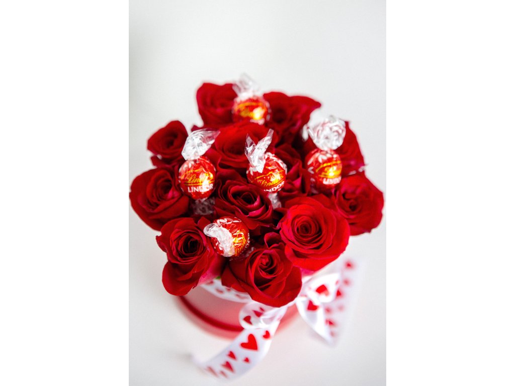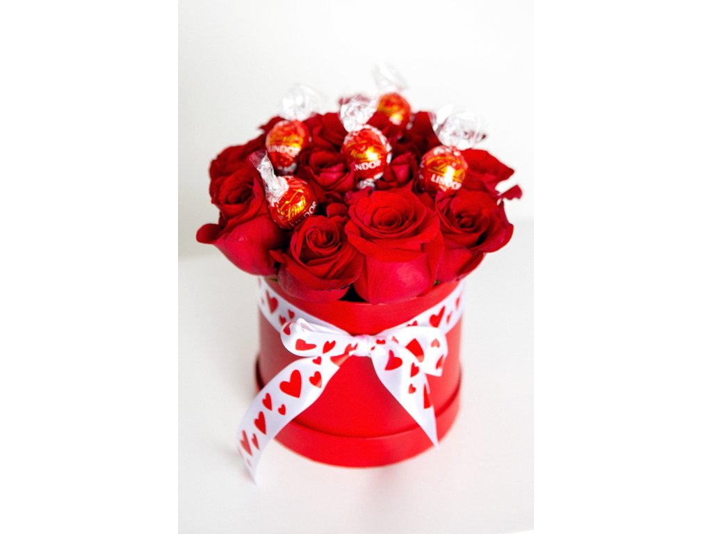 Flower box s červený s červenými růžemi a bonbóny Lindt, rozměr boxu 14x13 cm + aranžované květiny.
