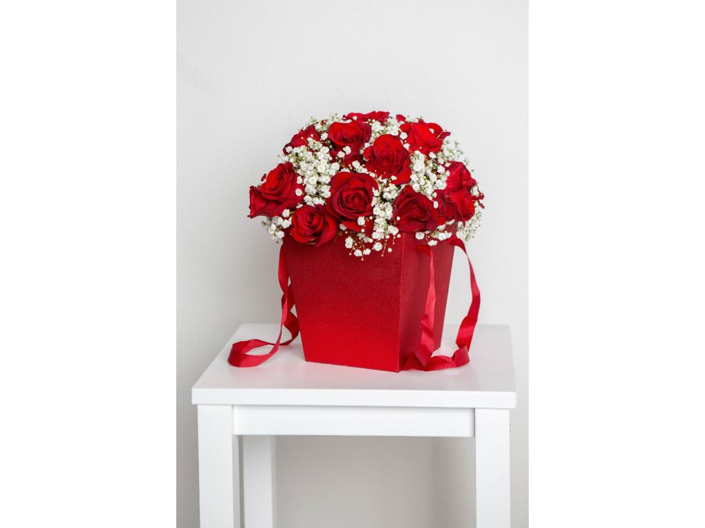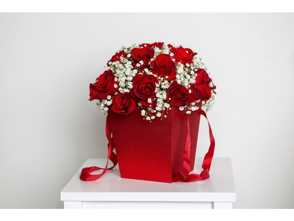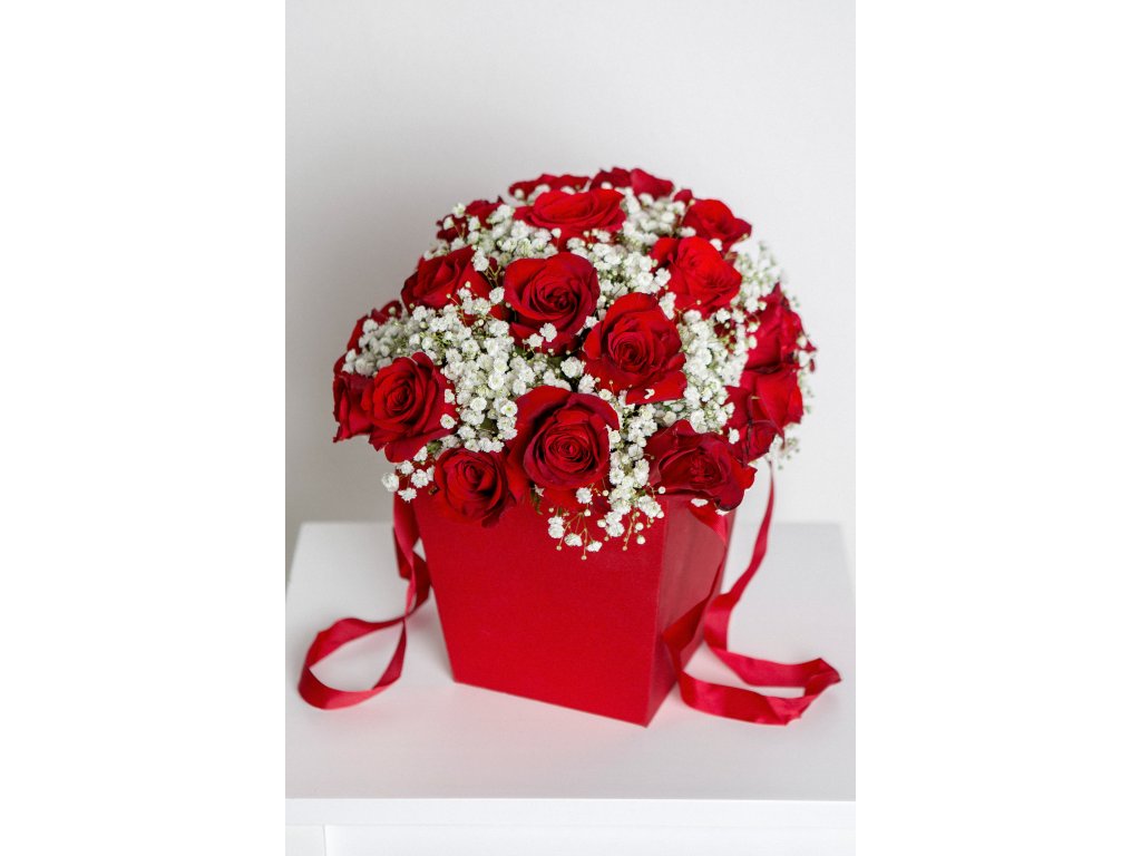 Flower box s červený s červenými růžemi a gypsophilou (Nevěstin závoj), rozměr boxu 17x17x18 cm + aranžované květiny.
