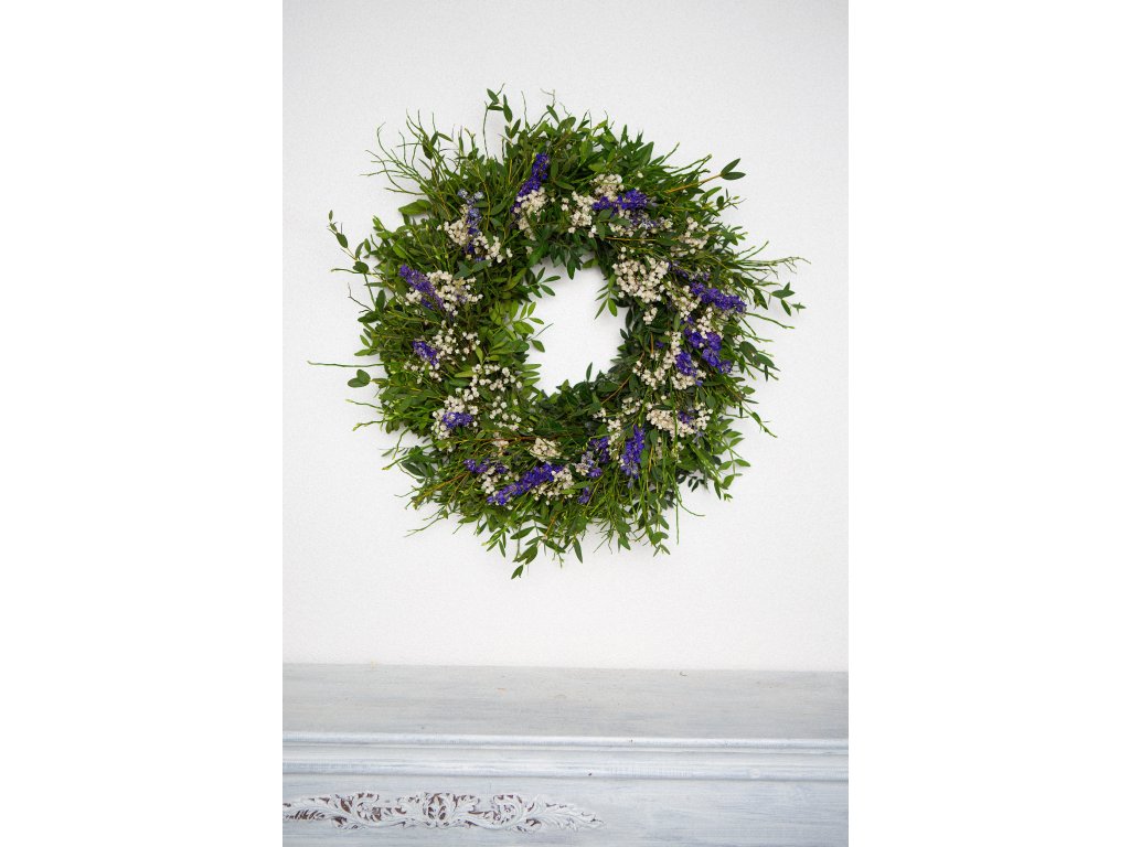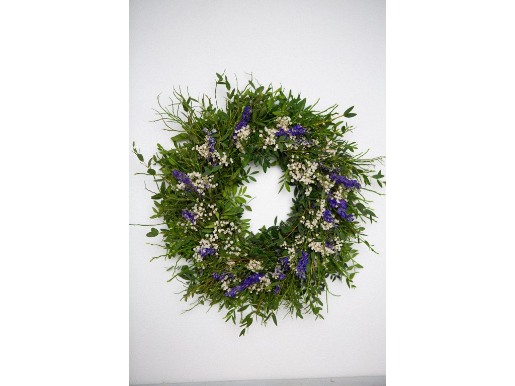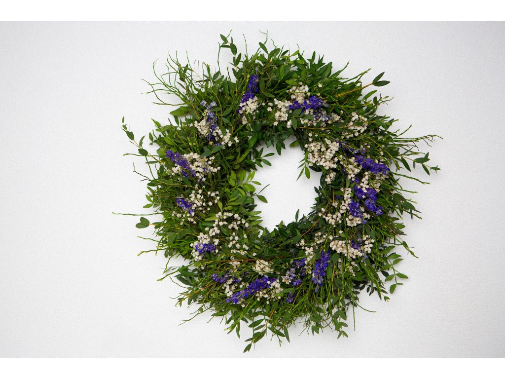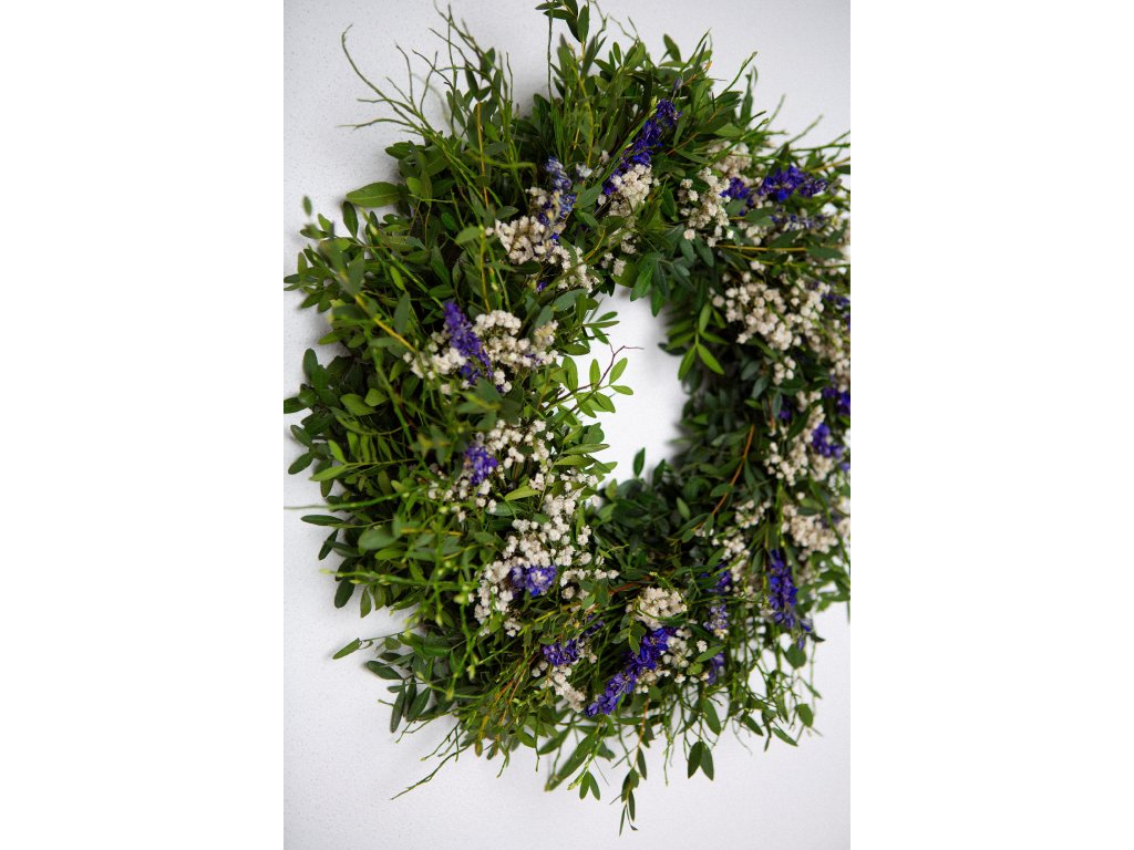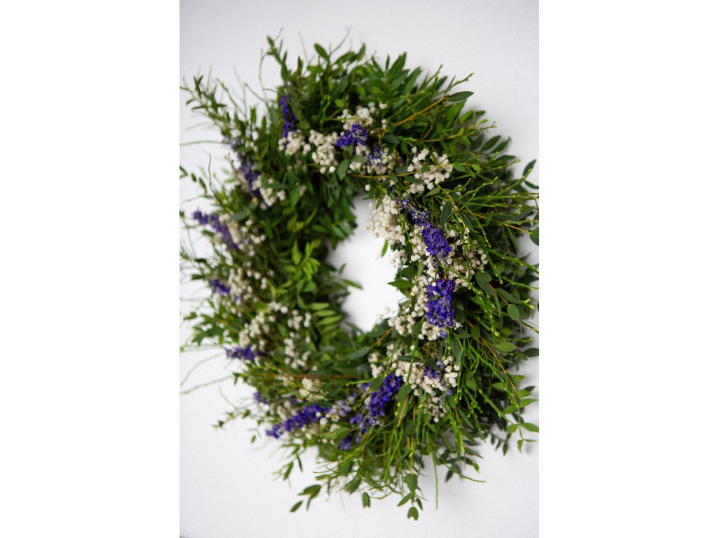 Věnec z borůvčí, eukalyptu, pistácie, nevěstina závoje a sušené stračky.